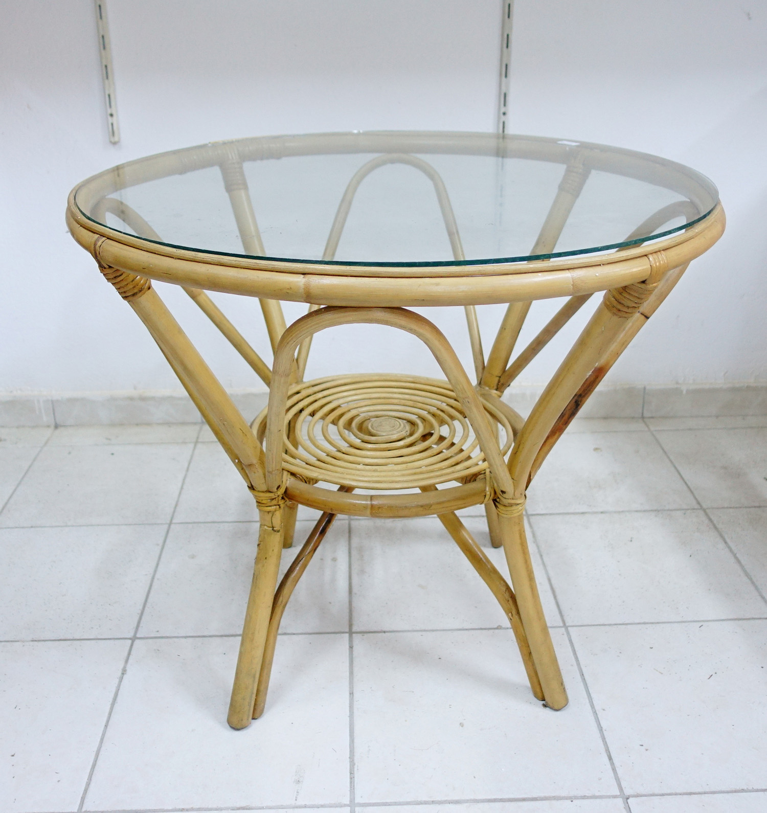 1 τραπεζακι διαμετρου 74 εκ χ 64 εκ ύψος. με τζάμι 5 χιλιοστών.